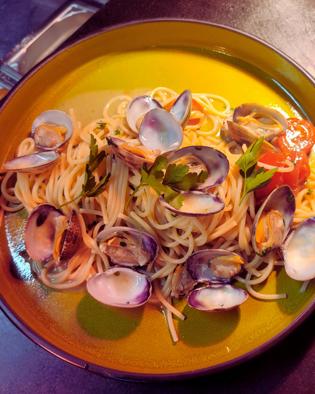 25€Pâtes aux Palourdes, Huile d’olive extra vierge, Persil, Tomates cerises, Ail